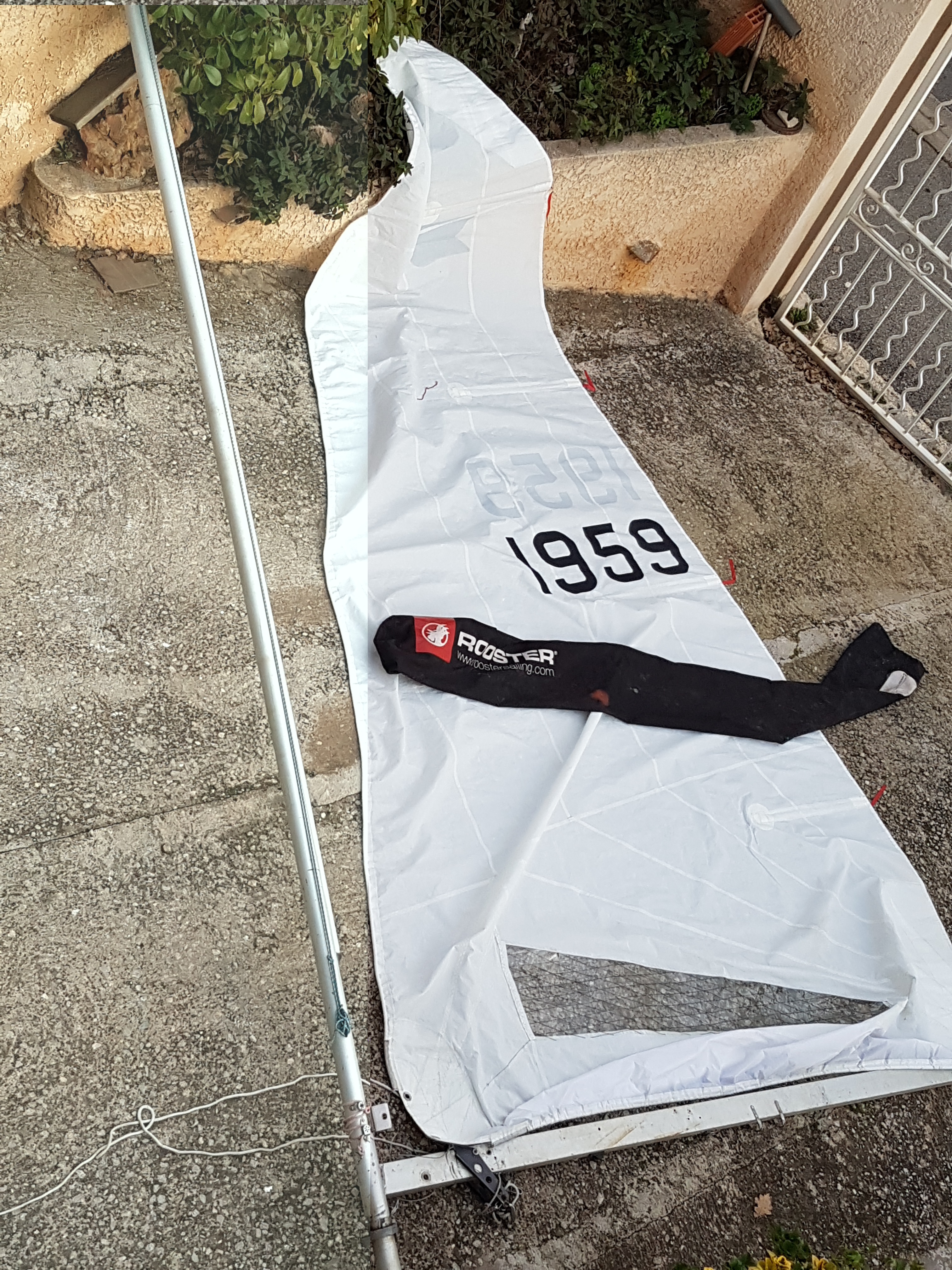 Ensemble mât aluminium needlspar tête noire + Voile TBE + bôme profil rectangulaire inclus levier de hale bas.