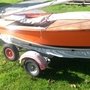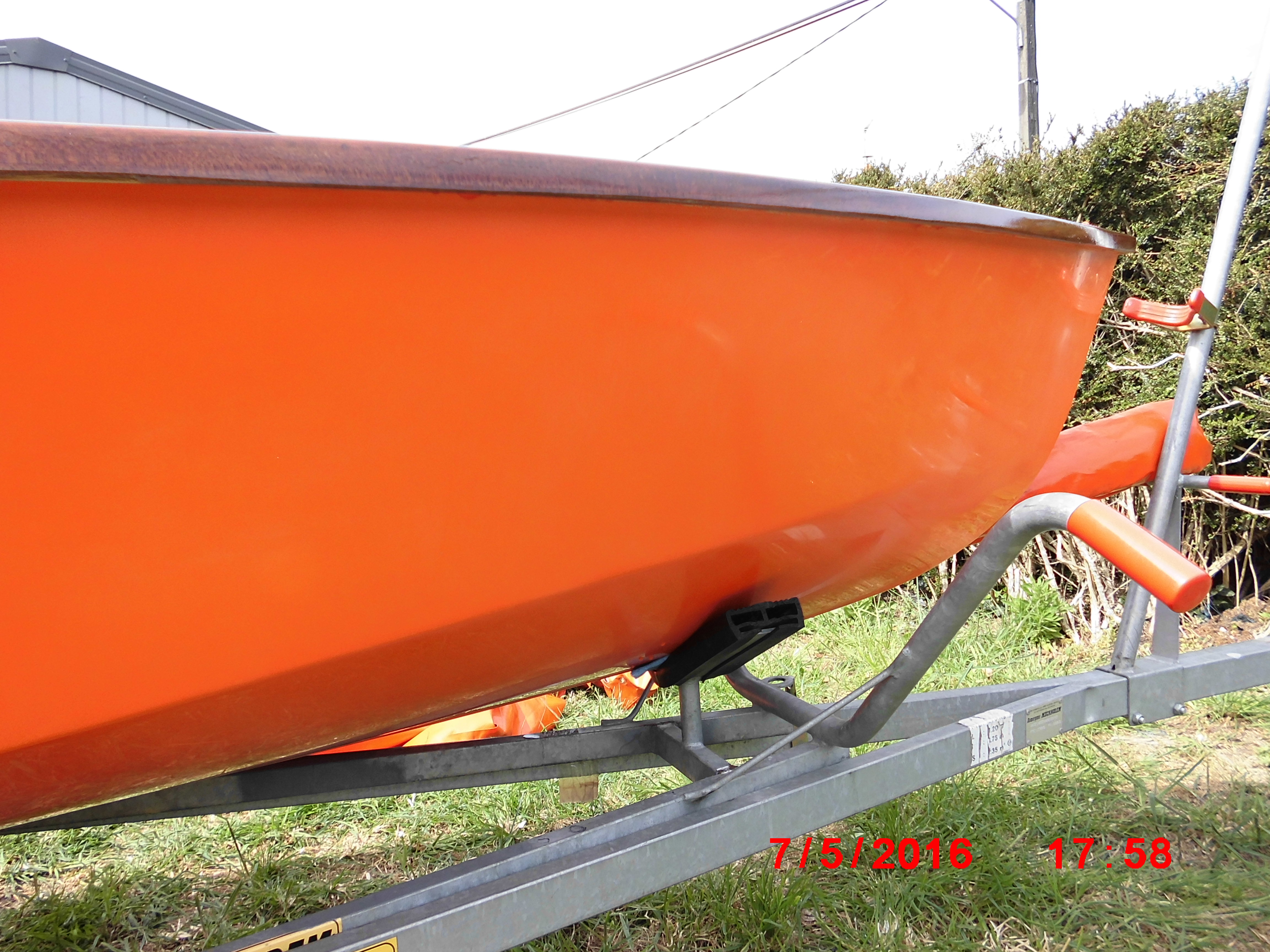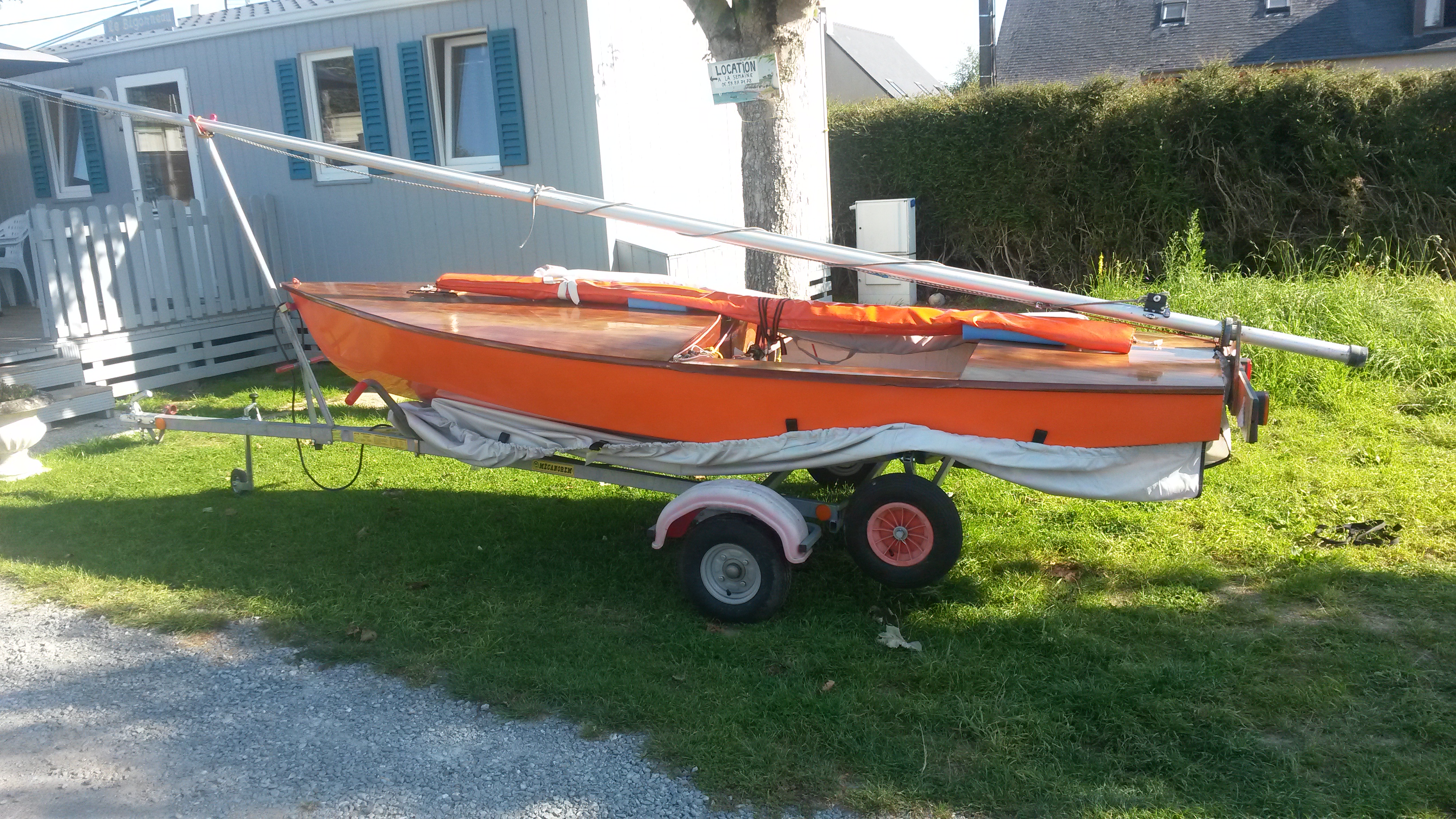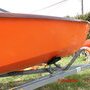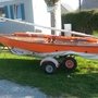 la Yole est transportée sur une remorque de marque Mécanorem D230C, avec chariot de mise à l’eau.