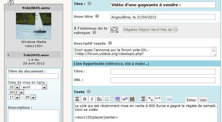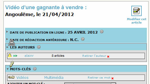 Voyez les différences de taille entre le .mov et le .wmv. (rapport de 16 à 1). Ce fichier vidéo, une fois réduit est lisible directement depuis l’article sans besoin de le télécharger. Pour chaque vidéo, j’ai fait une capture d"écran pour créer une vignette aux mêmes dimensions + éventuellement une micro vignette en 120 pixels de haut à associer à l’article (c’est l’image associée à chaque article visible depuis le portail du site)