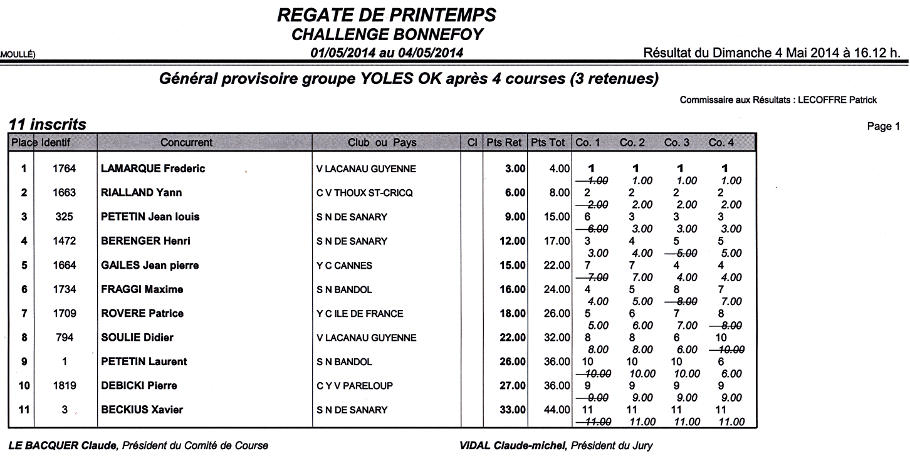 On a mangé ensemble, on a bien rigolé et on a été en plus invité au mois d’août au championnat national à Lacano, que du bonheur". Claude Le Bacquer (président de la ligue de voile PACA) a présidé le comité de course dimanche, et 4 manches ont pu se dérouler. De nombreux passionnés les ont observé du phare. Les conditions météos étaient cette fois très favorables, malgré un vent faible. Côtés résultats le challenge Bonnefoy est revenu à Frédéric Lamarque (Lacanau Guyenne) qui a remporté toutes les manches devant Yann Rialland (CV Thoux St-Cricq), Jean-Louis Petetin (SN Sanary) et Henri Berenger (SN de Sanary). L’ensemble de l’assistance aura été enchantée de ces 4 jours de Yoles OK, beaucoup ont profité des conseils avisés de Daniel Dahon et surtout ce fut l’occasion de redonner une seconde vie à un type de dériveur qui aura marqué les esprits. Une bonne idée, et il est fort à parier que la société nautique renouvellera l’expérience l’année prochaine.