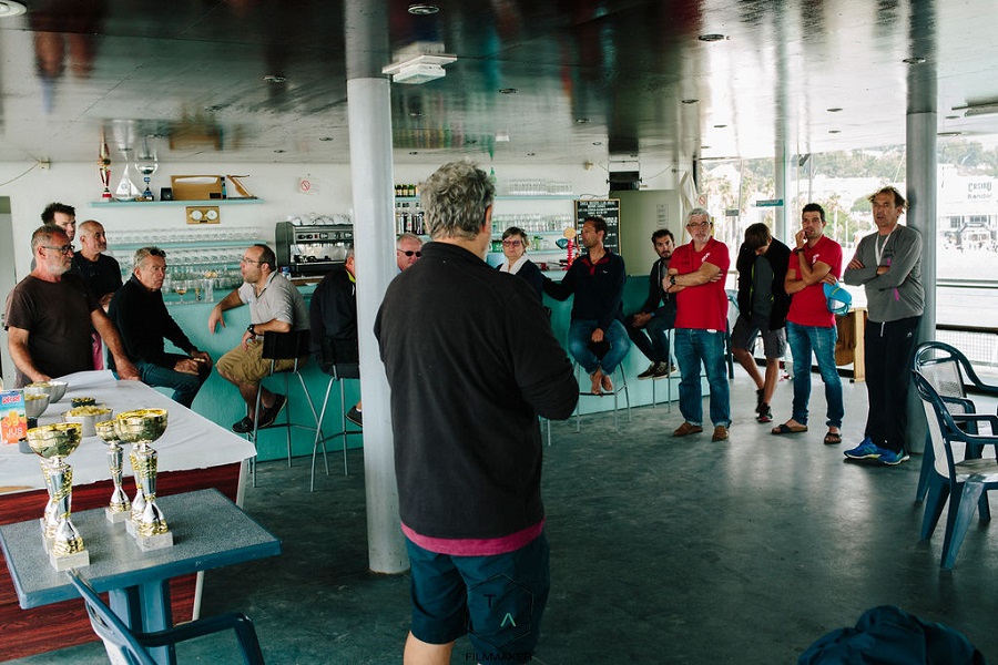 Pour conclure cette revue d’effectif ,il faut aussi noter les absences de Pierre Gary ,présent pour aider à la sécurité, mais les conditions étaient un peu trop soutenues pour notre valeureux doyen , de Jean Pierre qui à vendu son bateau à un belge qui doit rejoindre notre équipe du sud ,de Glen qui lui à vendu son mat ,et de Jean Christophe déjà blessé lors de l’Europeen qui a préféré se ménager et aller admirer les GC 32 foïler dans la rade de Toulon.
