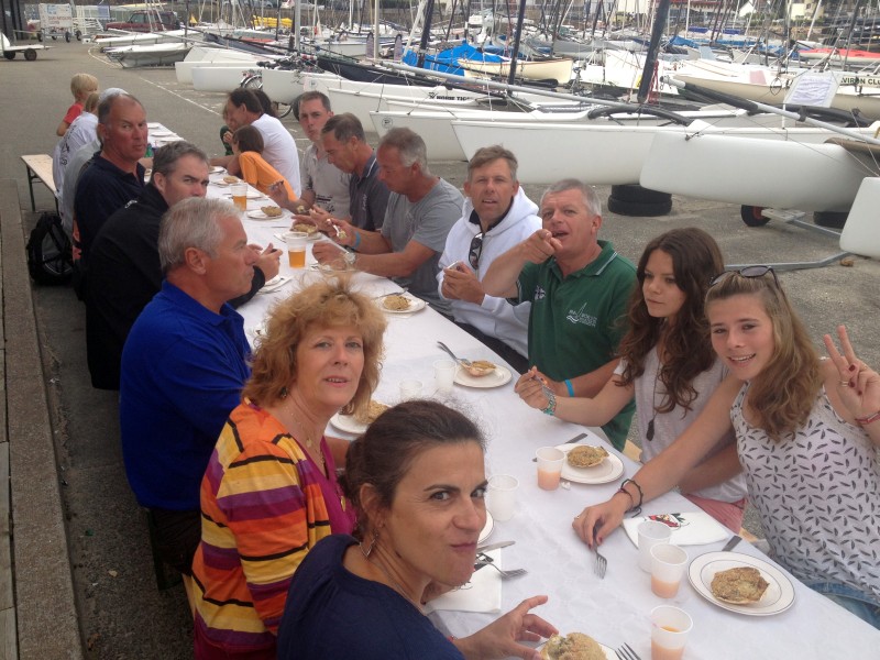 Que vous dire sur l’eau si ce n’est qu’à la première manche les français ont trouvé leur place naturellement.... et ont fait en sorte de ne pas la quitter sauf Alain qui a récolté les fruits d’un entraînement sérieux à La Rochelle et qui fait une superbe place de 14 à l’avant dernière manche. Vous l’auriez vu en rentrant à terre il était en lévitation et fier comme un bar tabac !