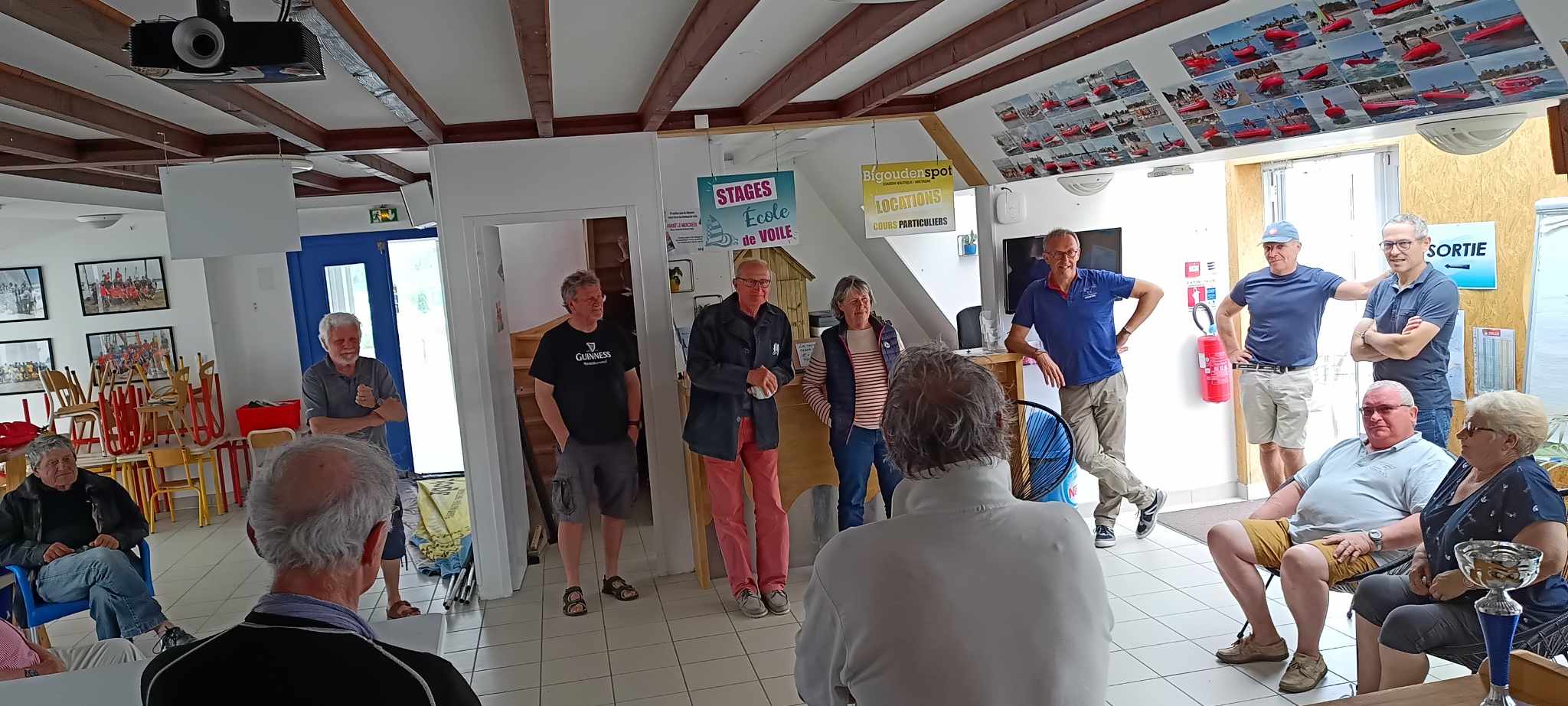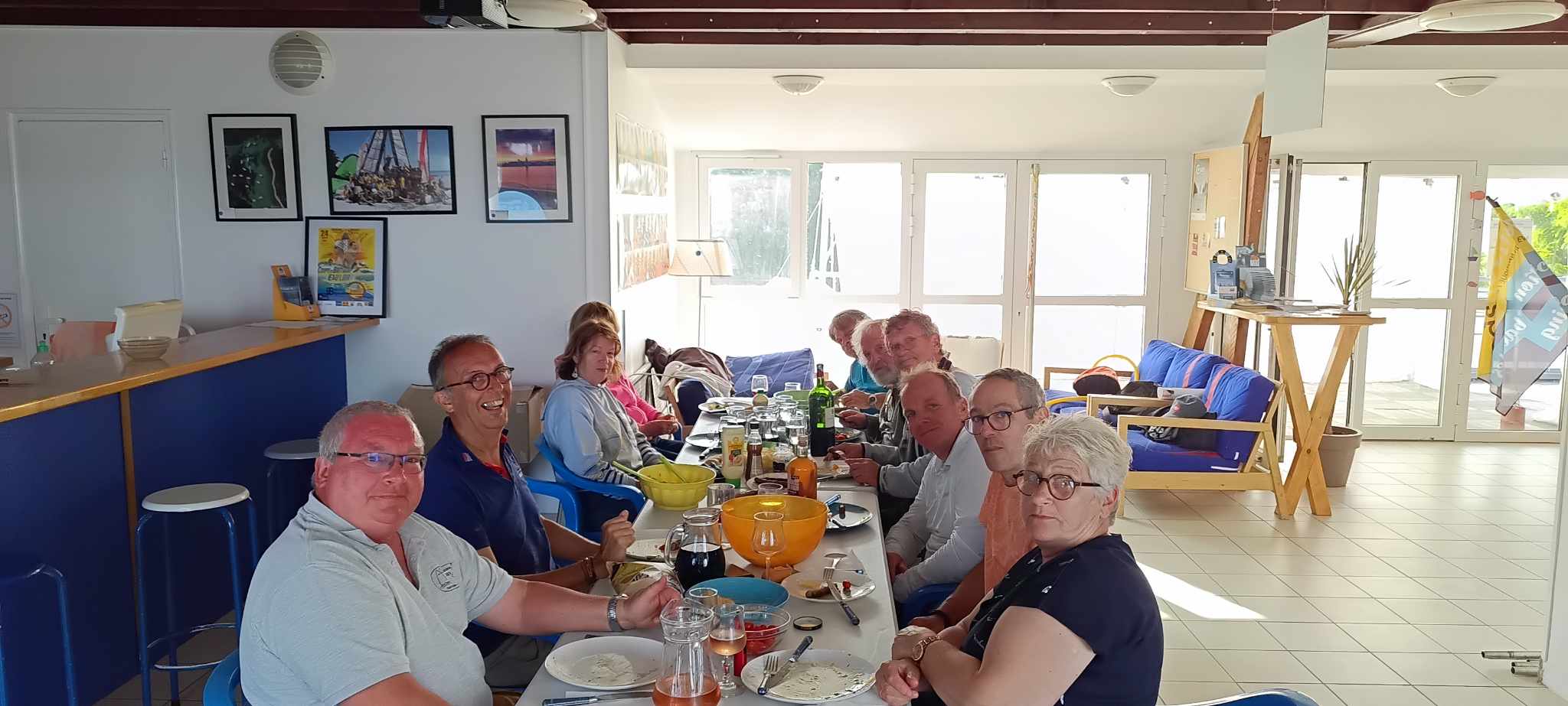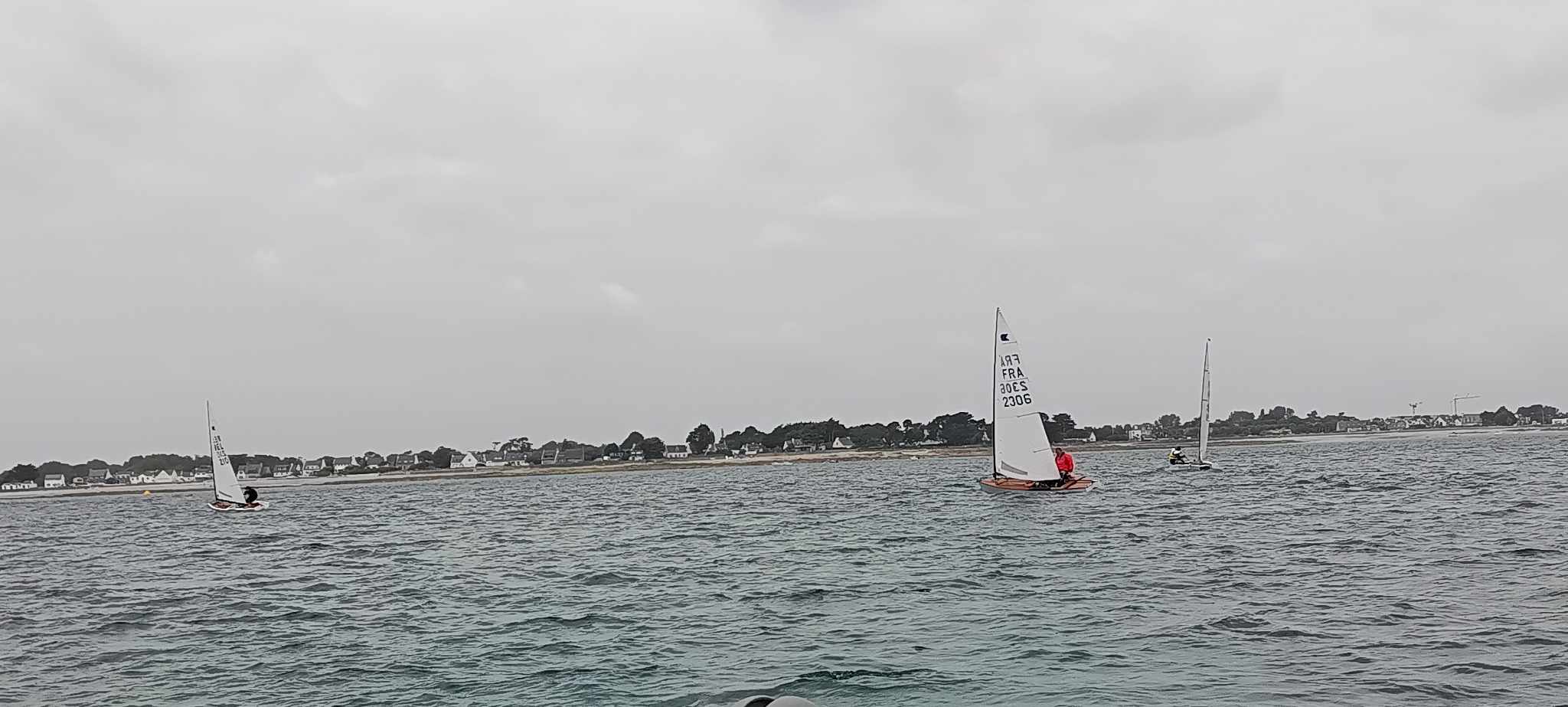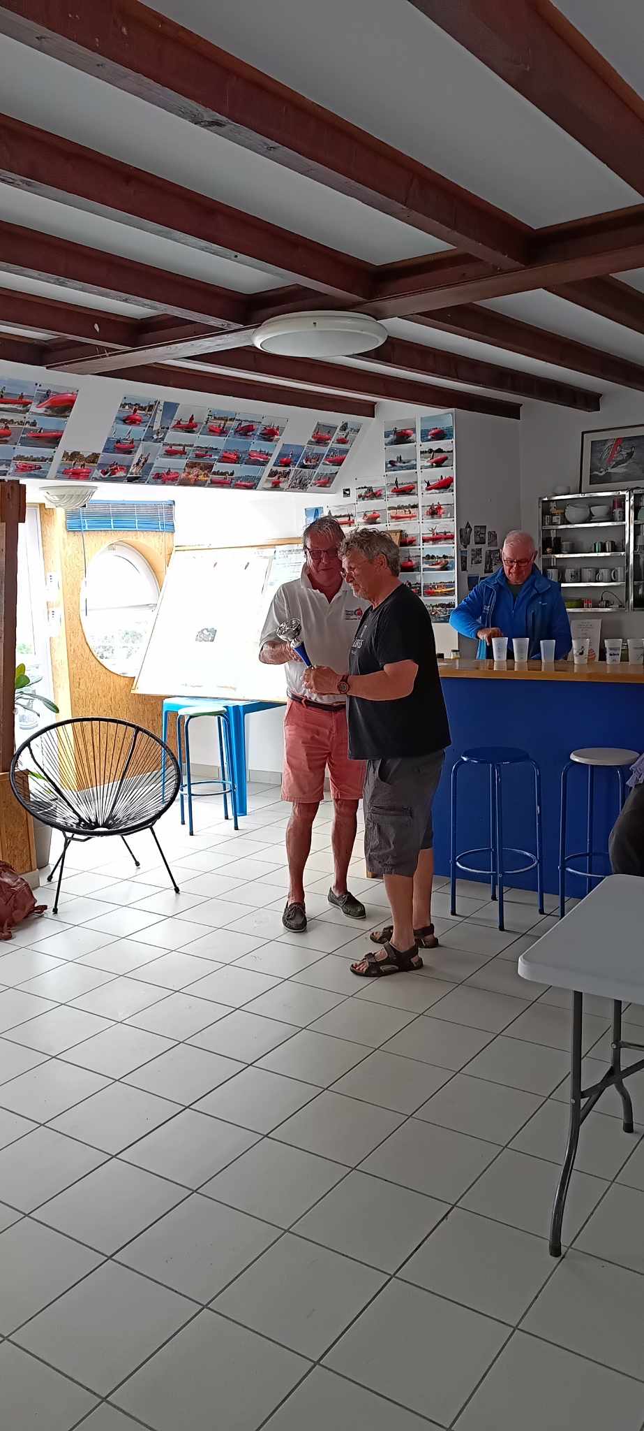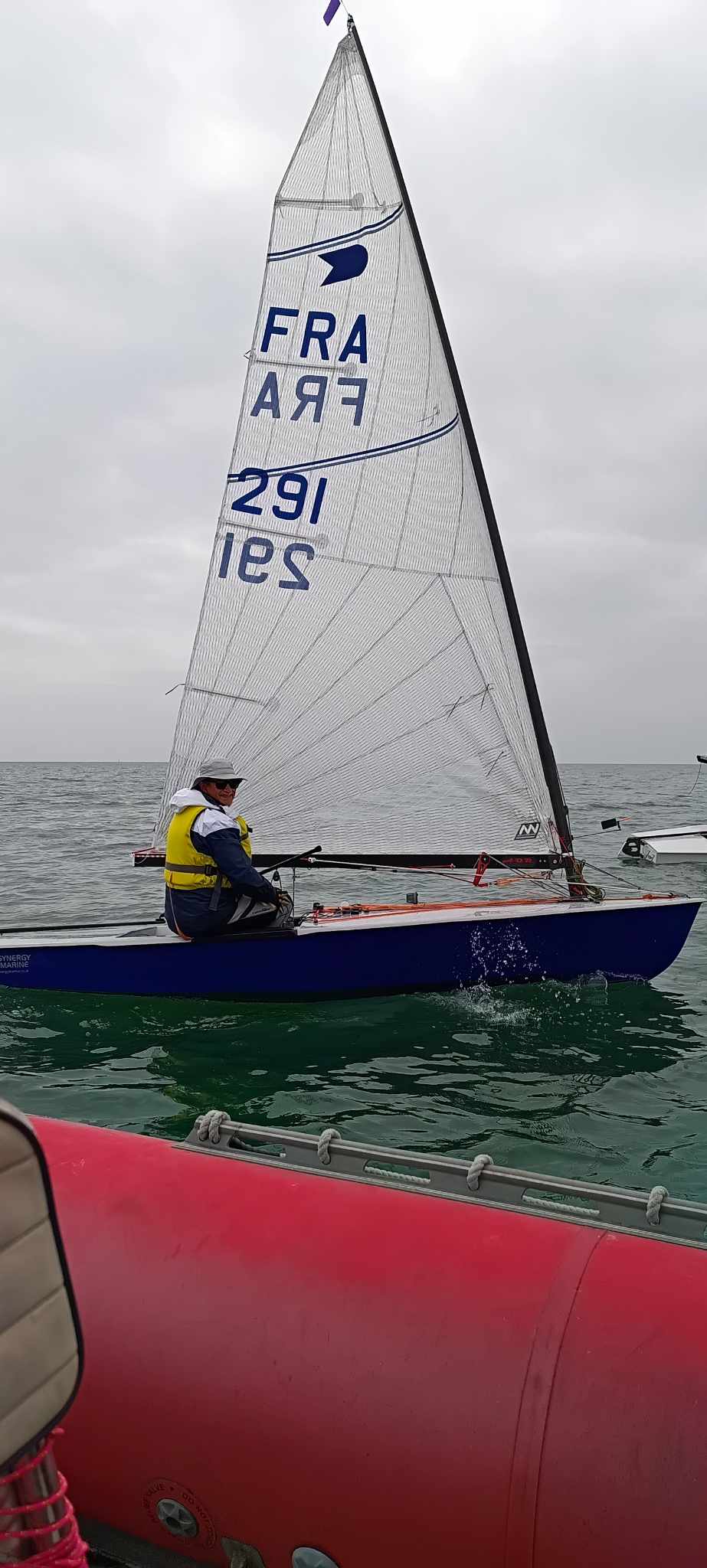 Journée particulière vent de15 a 27nds, trois courses, les trois courrues avec 3 bateaux, le reste de la flotte étant sagement resté a terre ou dessalée. Bruno gagne les 3 manches . la première devant Rémi (deux bateaux seulement terminent cette première manche, nous étions 5 mais Frédéric Casse son stick et rentre a terre chercher un autre safran.je dessale pres de la bouée de près et me rebousille l’épaule, impossible de remonter sur le bateau, ni sur le premier zodiac, heureusement le deuxième zod a une échelle, je ne peux plus bouger le bras donc regate terminée et peut-être la saison complète😭). A la première bouee de largue alors que les autres virent, Antoine avec son tout bois empanne et explose le cable acier de son hale-bas, la bome sort du mat et la voile sort du mat sur 20cm en au point de drisse, regate terminée pour lui aussi.Deux autres manches sont courrues avec Bruno Frédéric et Rémi, dans le même ordre au classement. Apres un sympathique repas tout le monde est parti reprendre des forces pour le lendemain.