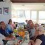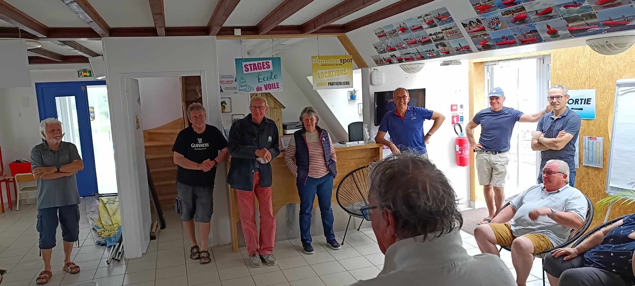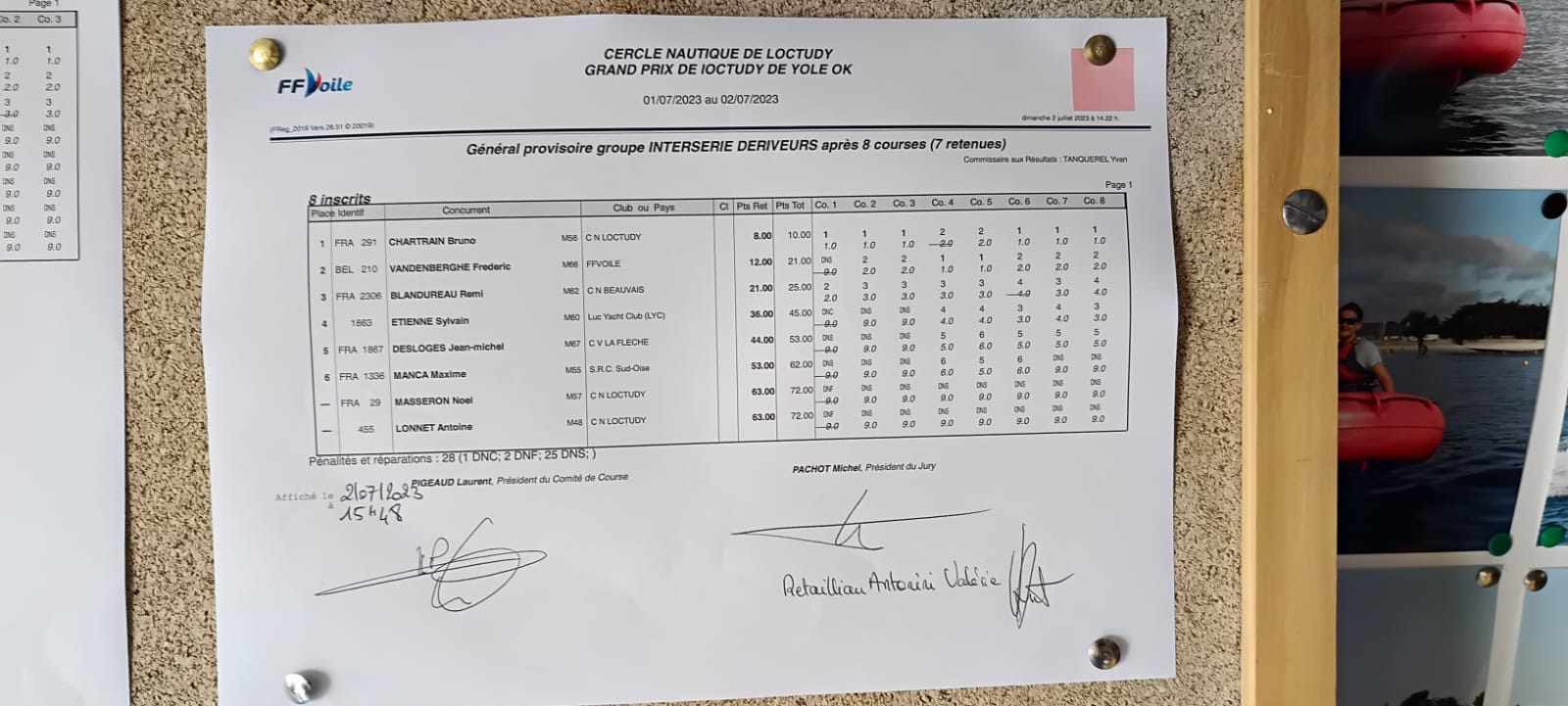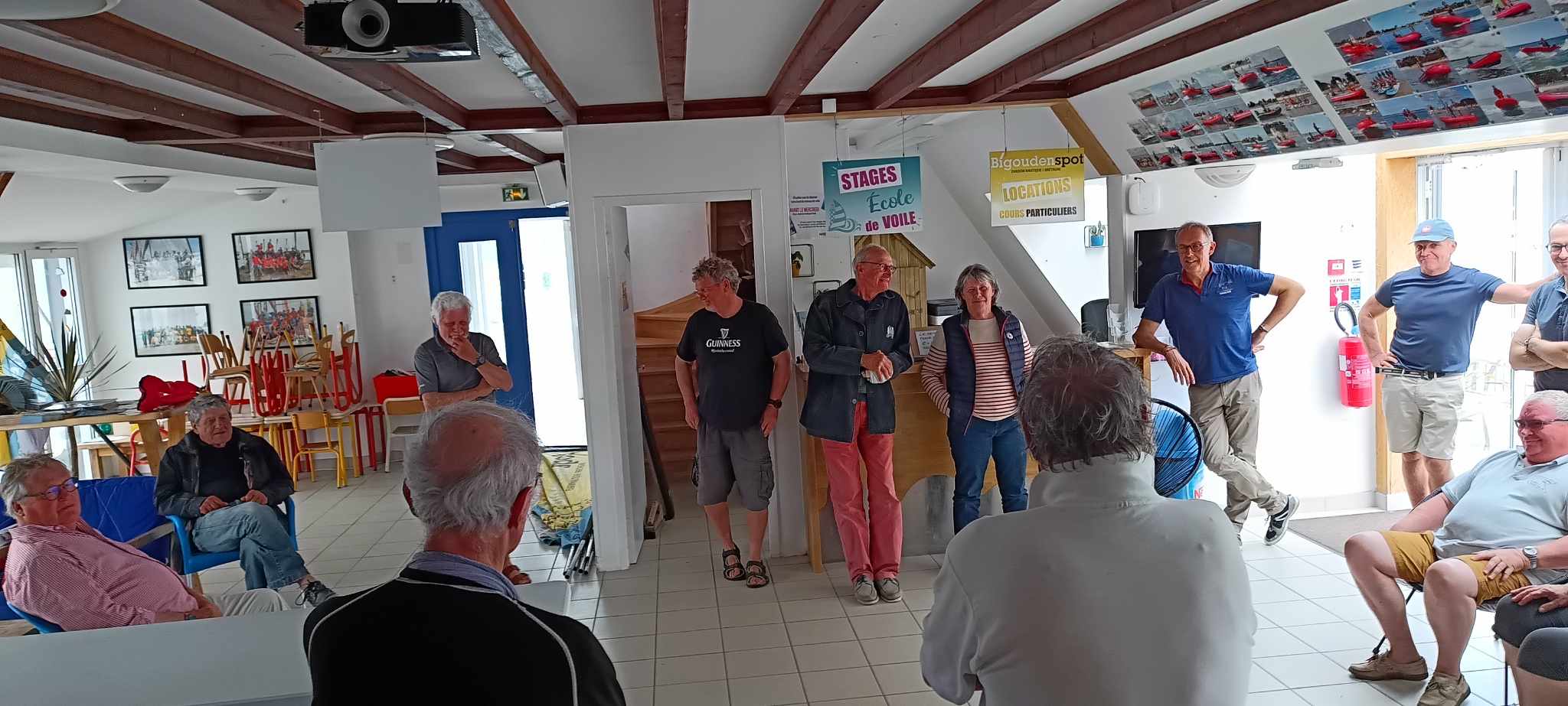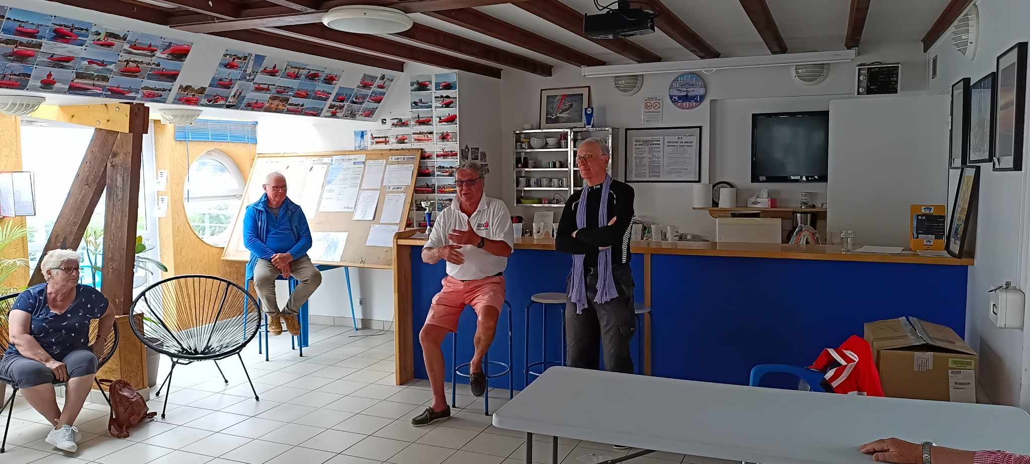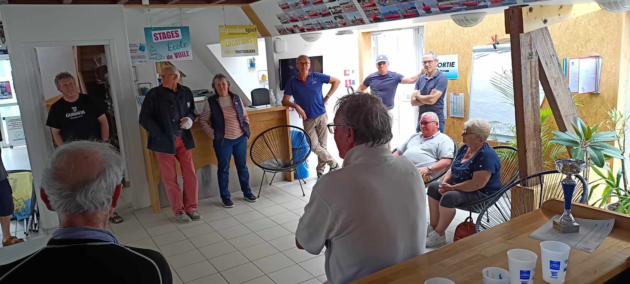 Journée particulière vent de15 a 27nds, trois courses, les trois courrues avec 3 bateaux, le reste de la flotte étant sagement resté a terre ou dessalée. Bruno gagne les 3 manches . la première devant Rémi (deux bateaux seulement terminent cette première manche, nous étions 5 mais Frédéric Casse son stick et rentre a terre chercher un autre safran.je dessale pres de la bouée de près et me rebousille l’épaule, impossible de remonter sur le bateau, ni sur le premier zodiac, heureusement le deuxième zod a une échelle, je ne peux plus bouger le bras donc regate terminée et peut-être la saison complète😭). A la première bouee de largue alors que les autres virent, Antoine avec son tout bois empanne et explose le cable acier de son hale-bas, la bome sort du mat et la voile sort du mat sur 20cm en au point de drisse, regate terminée pour lui aussi.Deux autres manches sont courrues avec Bruno Frédéric et Rémi, dans le même ordre au classement. Apres un sympathique repas tout le monde est parti reprendre des forces pour le lendemain.
