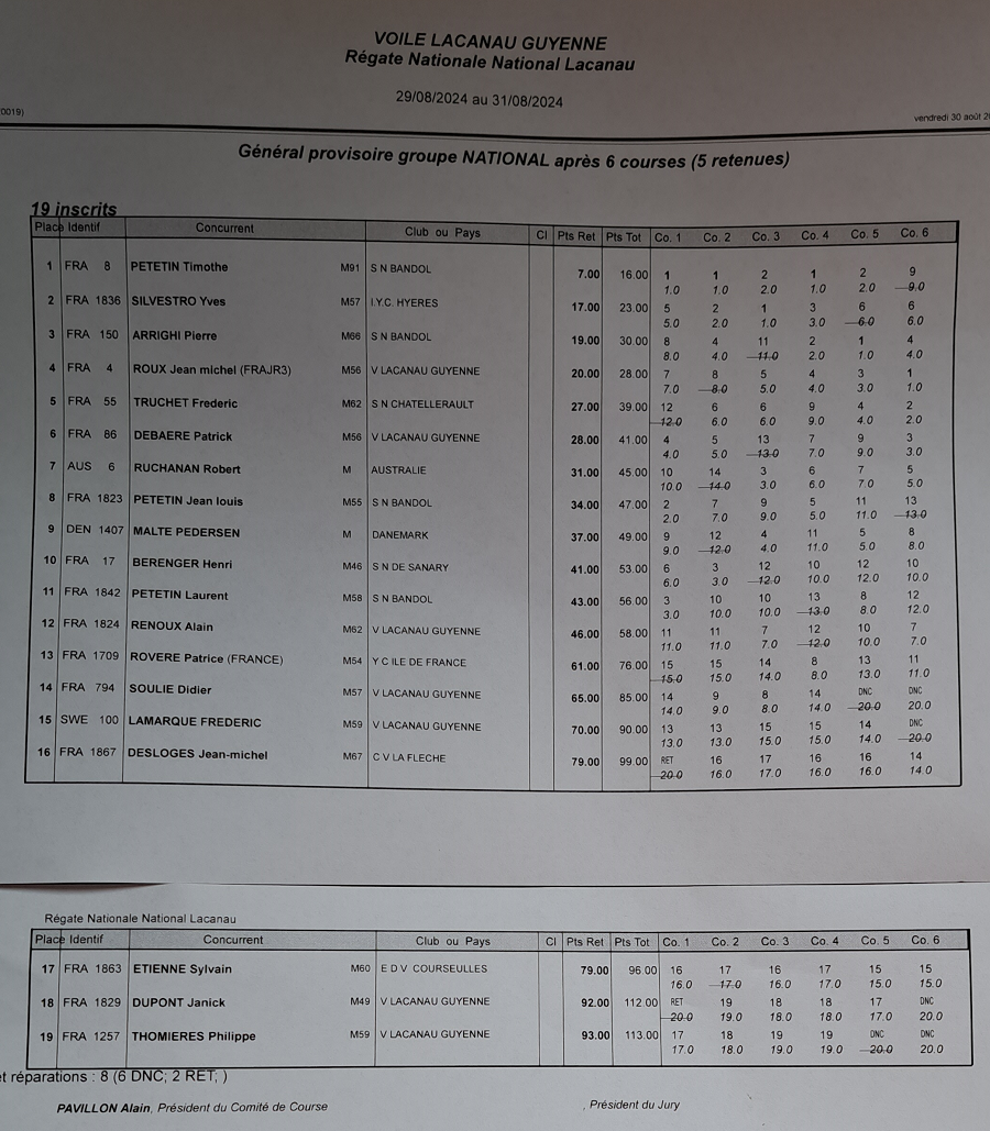 Au total, un Tim toujours au dessus des gros lots de yolistes ; Yves et une belle seconde place pour une "reprise", on espère le revoir dans la série ; Bob toujours aussi précis dans sa navigation qui sort une 3ème place lors de la troisième manche avec son bord à droite toute sur le 1er près ; Henri qui attaque fort à l’entame de la première manche du vendredi et sa 3ème place ; notre président qui finit dans une bonne dynamique et sa 3ème place lors de la dernière manche du vendredi ; à noter, la prometteuse 5ème place au général d’un nouveau venu, Frédéric Truchet et sa magnifique Ovington sortie d’usine.