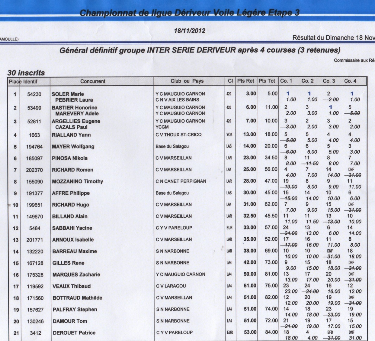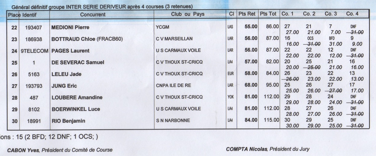 Donc 3 bons 420 = trois 420 aux 3 premières places. 27 solitaires, je fais 4e au général et premier solitaire, Amandine 28e au général avec les places de 29e, 28e, 24e, elle n’a pu finir la dernière manche à cause d’un vide-vite HS, il est resté bloqué à mi ouverture et dans une manche de pétole (dernière manche), ce n’est pas l’idéal, donc ce fut une rentrée avec le sous-marin rouge (ce qui devrait rappeler des souvenir à certains).