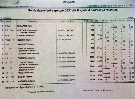 Dériveurs : 2 Yoles dont Pierre Debicki et vu de mon bateau le plus beau c’était lui, 1 RS 500, 1 Europe, 1 laser standard, 1 29er, 3 lasers radiaux dont Kévin qui faute de Yole à loué un laser, 1 B14, 1 49er, 1 RS 700, 1 RS 701, donc beaucoup de doubles et solitaires à échelles.