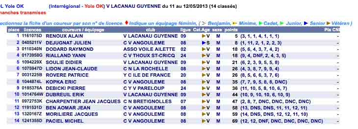 Cette régate à été marquée par la bonne vitesse d’Alain Renoux ( merci Raymond durant les speed-test), bon départ, très régulier la plus mauvaise manche est une manche de 4 avec 5 manches gagnées. Dejugnat Julien nous a offert le même type de navigation avec 2 manches gagnées et une plus mauvaise manche de 11 mais si l’on retire celle là, c’est une manche de 3 qui est la plus mauvaise.