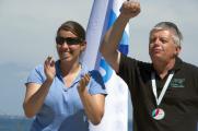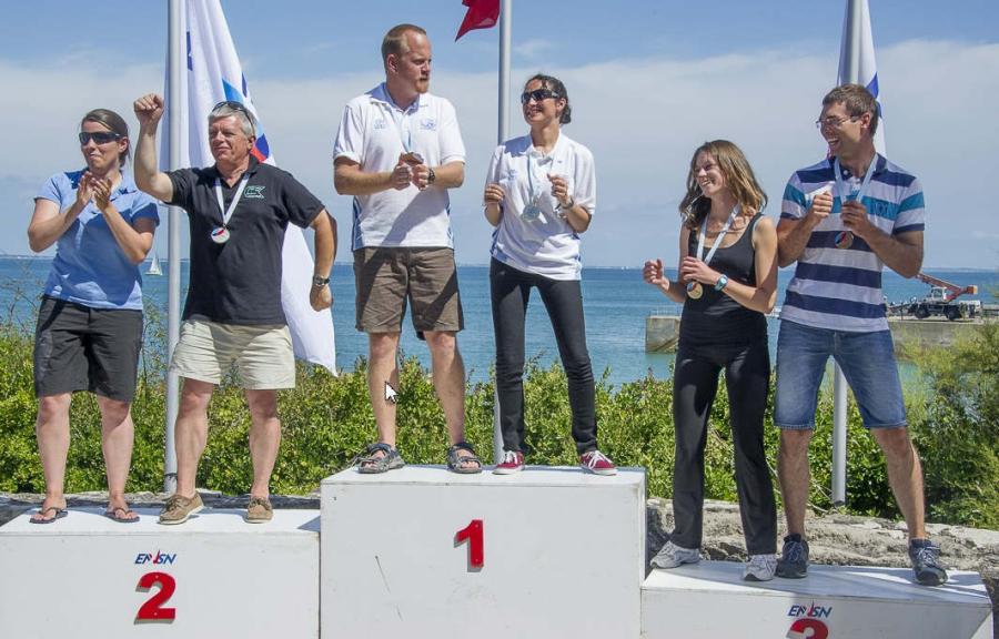 Nota : la charmante jeune femme sur le podium avec moi n’est pas mon équipière ni ma maitresse, c’est charlotte 1ère féminine en laser radial qui fut une adversaire redoutable et très agréable.