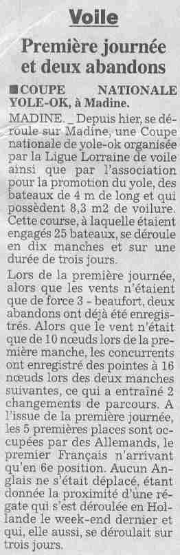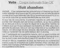 Une douzaine de Yoles prendront le départ, 6 termineront malgré de nombreux dessallages. René Delecluse, 64 ans, plusieurs fois vainqueur de la coupe nationale, termine tout de même la course en prenant le minimum de risques.