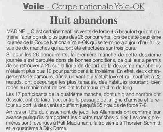 3 manches courues sur un super olympique par un bon vent de force 3. Ralf emporte les 3 manches. Jean-Patrice fait chapeau et repart avec un mat qui a fait un tour de trop sur lui-même et a du coup de gros soucis à régler son bateau d’où abandon. Michel Fournié découvre les possibilités de transformation d’une Yole-OK en baignoire, l’étanchéïté de son bateau ayant quelques faiblesses.
