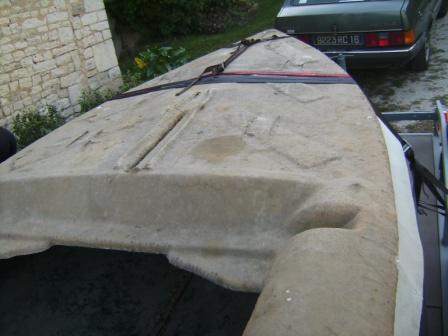 Nous nous sommes également rendu chez la personne qui lui hébergeait depuis quelques années déjà les fameux moules. Ils étaient encore là et à priori en pas si maivais état que ça. Nous les avons chargé rapidement sur le plateau que j’avais emmené, nous avons intercallé entre les deux moules du plastique à bulles, des morceaux de feutre et de moquette (heureusement que JP m’en avait parlé car je n’y aurait pas pensé). Nous avons sanglé tout ça avec soins et nous sommes retournés chez JP.